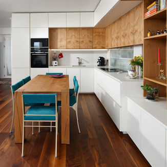 Cucina in legno laccato con basi opache e pensili lucidi che amplificano la luminosità grazie al loro effetto riflettente.